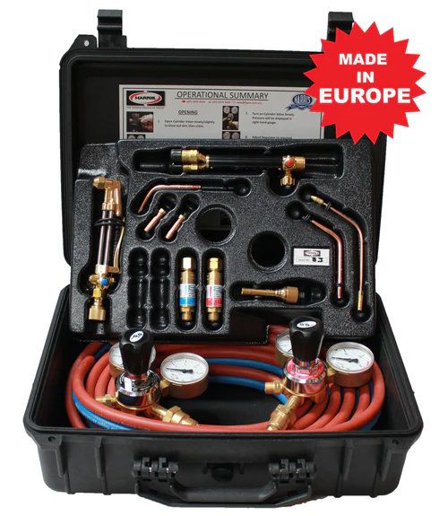 Craftsman Upgrade Kit Oxy/Acet includes Model 601 regulators - side entry, cutting attachment, handle with flashguards, mixer, cutting/brazing tips, flexible brazing tip, flashback arrestors & 10m of 6mm hose in a storm case. Suited for Brazing/Heating/Cutting/Welding and ideally used by plumbers and refrigeration mechanics. The regulators are ideally suited for the mobile light trade. Flexible tip allows the operator to get into tight places. The Harris mixing system uses gas at much lower pressures which provides gas savings and increased safety. Operators will enjoy the front mounted valves, providing the ability to alter flame one handed.